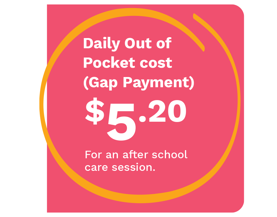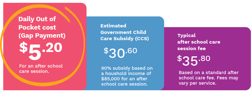 The Brown family income is $85,000 so they are eligible for a Child Care Subsidy of 90%. After the Government subsidy, an after school care session will cost the Brown family $5.20 per day, based on a standard after school care session fee of $35.80.